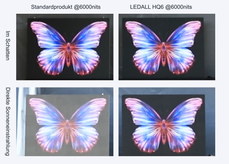 Mit modernsten Shadern und einer speziell entwickelten Oberflächenstruktur erreicht unser LED-Display selbst bei direkter Sonne höchste Kontraste. Reflexionen werden reduziert, Farben bleiben lebendig und Inhalte klar erkennbar – jederzeit auch bei ungünstigen Lichtverhältnissen.